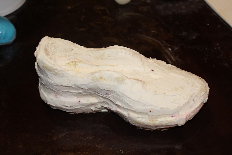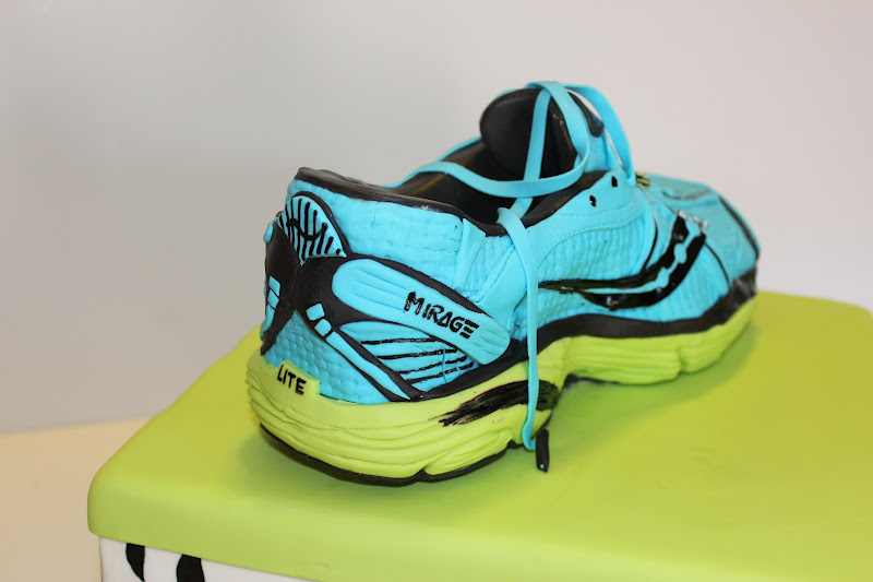 This birthday girl runs with the same running group I used to run for and is a marathon runner herself. For her birthday party, she wanted her favorite running shoe as her birthday cake. How exciting!! And what made it even more fun was her favorite shoe is neon blue and green! So, as soon as I got this order I went out and bought the shoes....I had to have the real life thing sitting in front of me if I was going to sculpt it out of cake! Thankfully the store accepts returns if the shoes were never worn :)